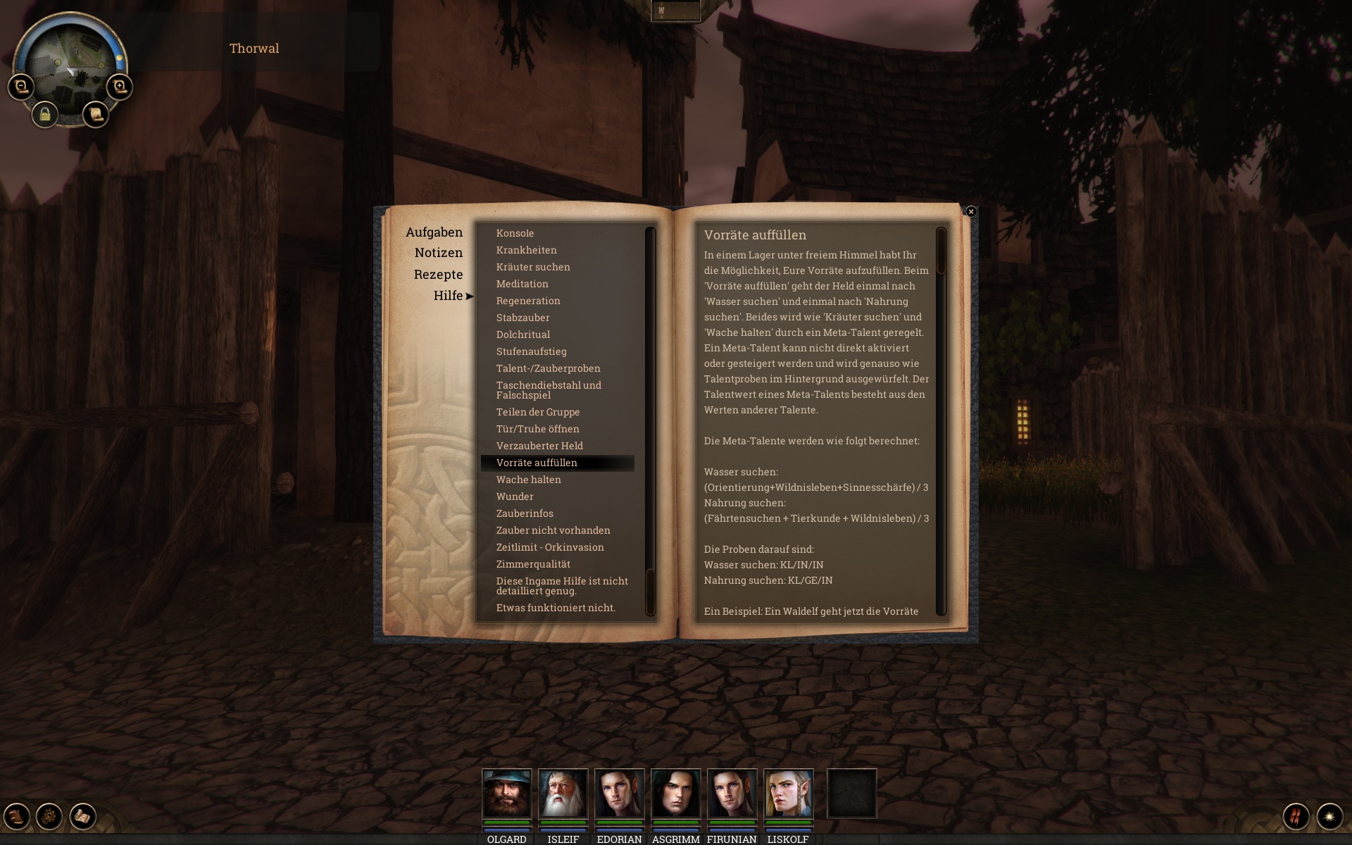 [spoiler]In einem Lager unter freiem Himmel habt Ihr die Möglichkeit, Eure Vorräte aufzufüllen. Beim 'Vorräte auffüllen' geht der Held einmal nach 'Wasser suchen' und einmal nach 'Nahrung suchen'. Beides wird wie 'Kräuter suchen' und 'Wache halten' durch ein Meta-Talent geregelt. Ein Meta-Talent kann nicht direkt aktiviert oder gesteigert werden und wird genauso wie Talentproben im Hintergrund ausgewürfelt. Der Talentwert eines Meta-Talents besteht aus den Werten anderer Talente.