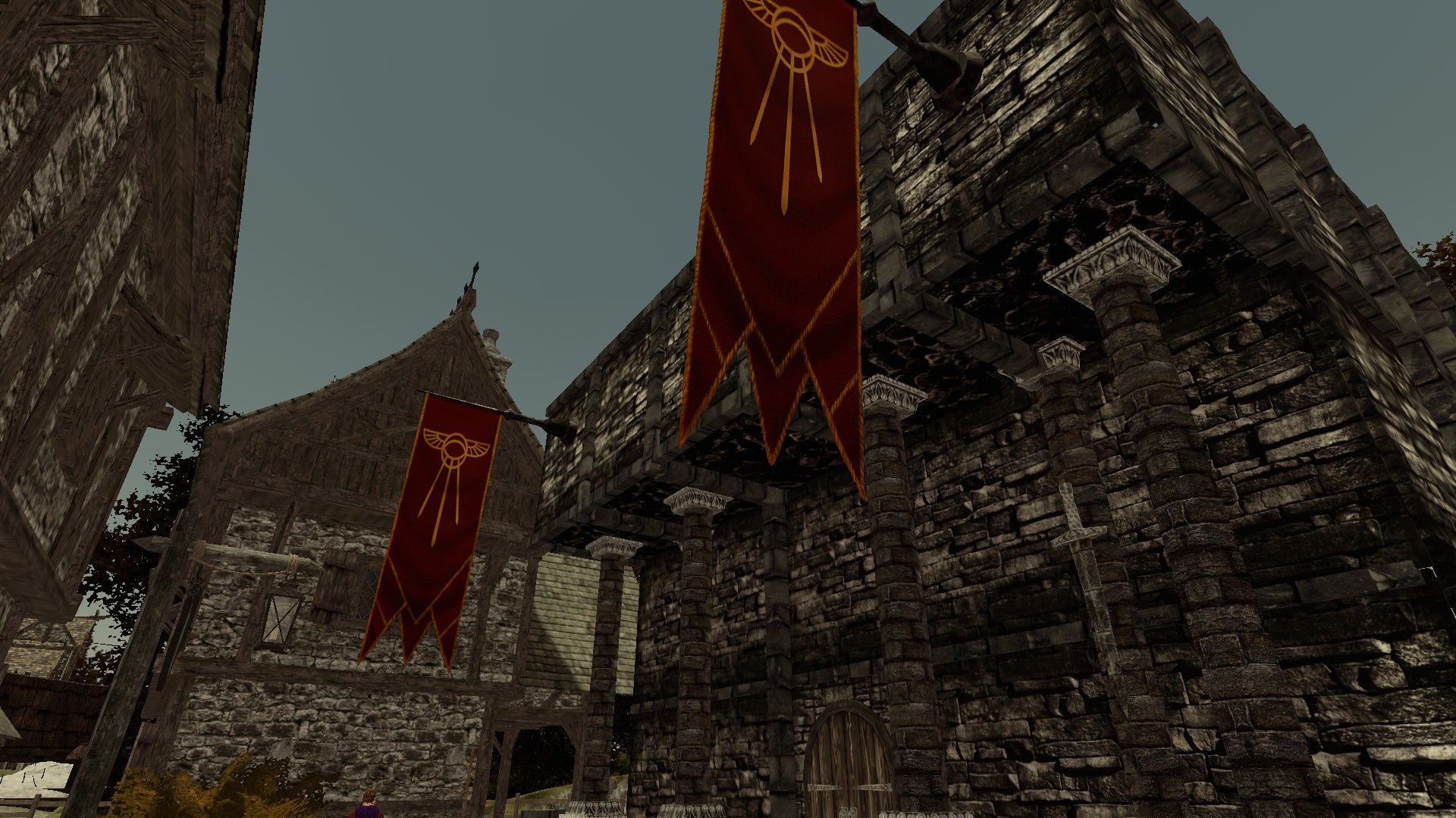 Ich wurde darum gebeten, für meine Tempelflaggenmod ein paar schöne Screenshots zu erstellen. Nun hatte ich damit ohnehin schon Probleme, weil die Flaggen im Spiel noch gar nicht überall ersetzt werden. Da wo das funktioniert, hat wiederum die Umgebung ihre Probleme. Beispiel Kvirasim: Die ganze Zeit düstergrauer Himmel, Beleuchtung der Bäume funktioniert nur nachts (?), der Tempel ist tagsüber gar nicht beleuchtet (sieht zumindest so aus).