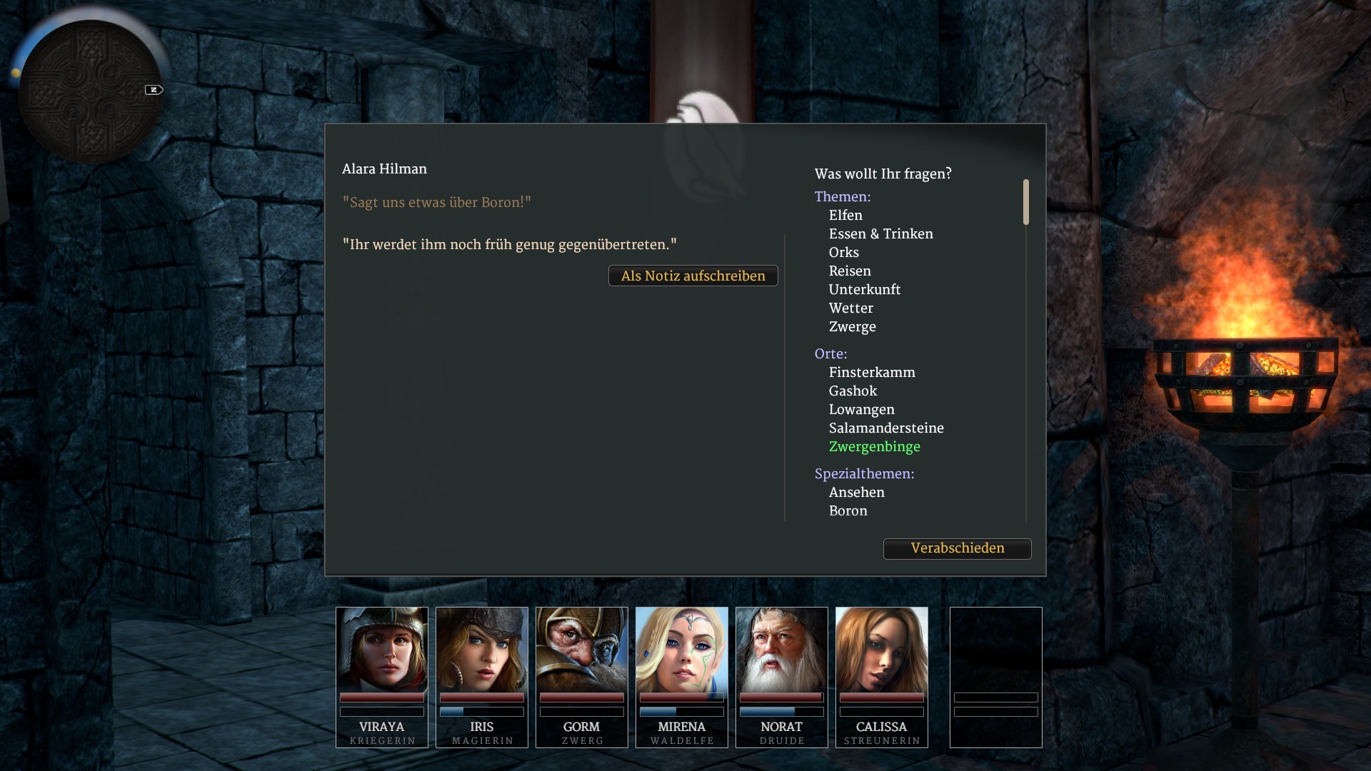 Wenn ich im Anfangstempel die dortige Perainegeweihte etwas über ihre eigene Gottheit frage, sollte man meinen dass sie genau darauf nur gewartet hat um meiner Gruppe diverse Dinge über Peraine zu erzählen. Leider ist dem nicht so. Man erhält nur einen einzigen Satz als Antwort...
