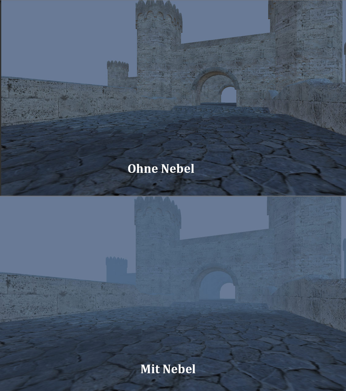 Ich meine auch gar nicht unbedingt irgendwelche herumwabernden Nebelschwaden, sondern reduzierte Sichtweite, in etwa so (habe ein einfaches Beispiel in Unity zusammengebastelt):