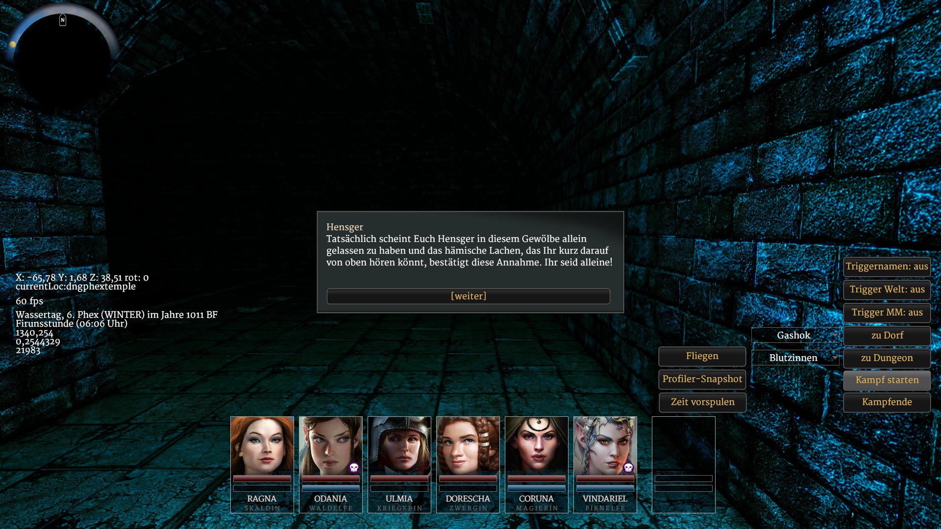 Wenn man mit Charakteren, die unter Raumangst leiden, den Phextempel in Tiefhusen betritt, kommt als allererstes die Meldung, dass der betreffende Charakter sich hier nicht wohlfühlt. Erst danach folgen die Beschreibungsfenster, wie die Charaktere überhaupt dort hineingelangen etc.
