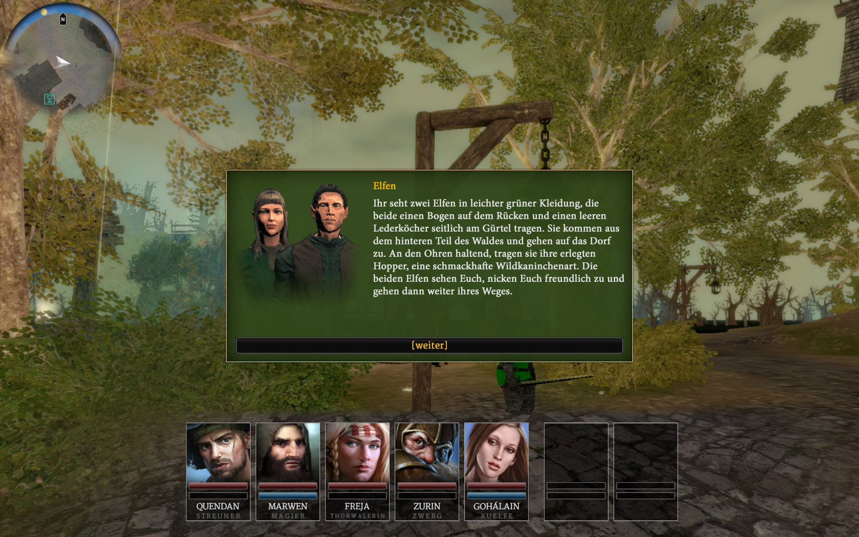 Habe ein neues Dialogbildlein für zwei der Kvirasim-Stadtbegegnungen gemacht. Und zwar für die 2 Elfen, die zur Jagd gehen bzw. von der Jagd zurückkehren sowie für die Begegnung mit den 2 Elfen, die Musikinstrumente dabei haben und die Helden zu nem Ständchen einladen.