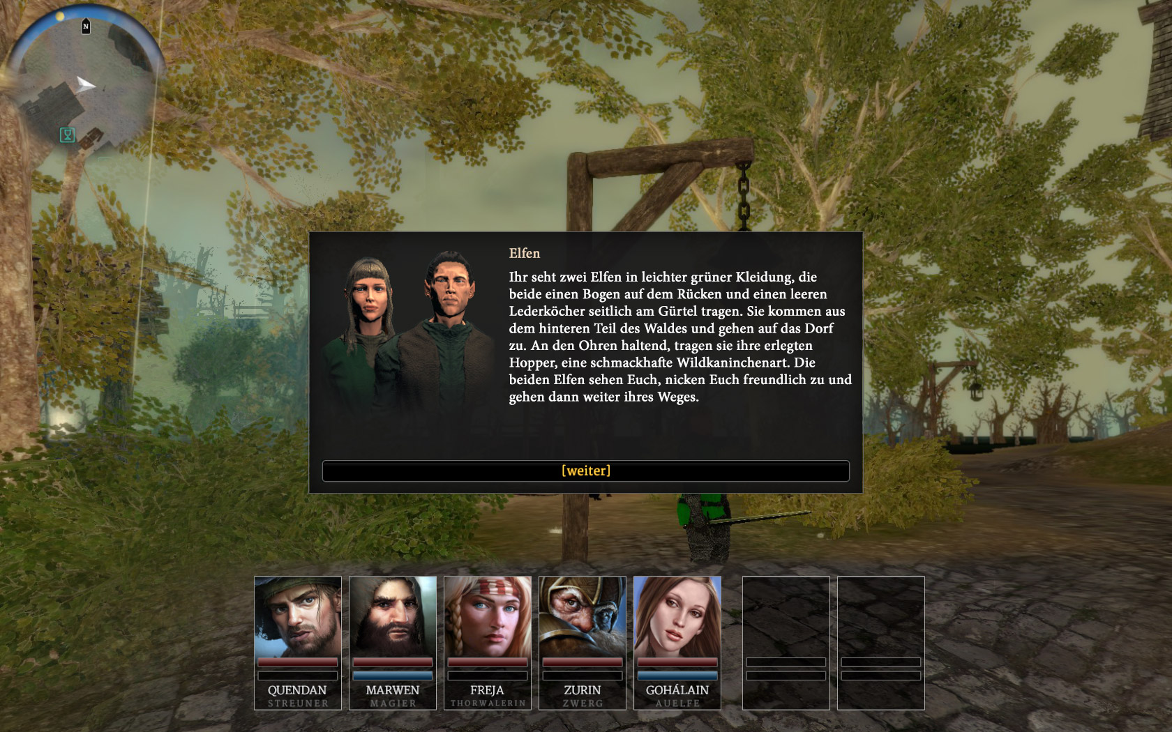 Habe ein neues Dialogbildlein für zwei der Kvirasim-Stadtbegegnungen gemacht. Und zwar für die 2 Elfen, die zur Jagd gehen bzw. von der Jagd zurückkehren sowie für die Begegnung mit den 2 Elfen, die Musikinstrumente dabei haben und die Helden zu nem Ständchen einladen.